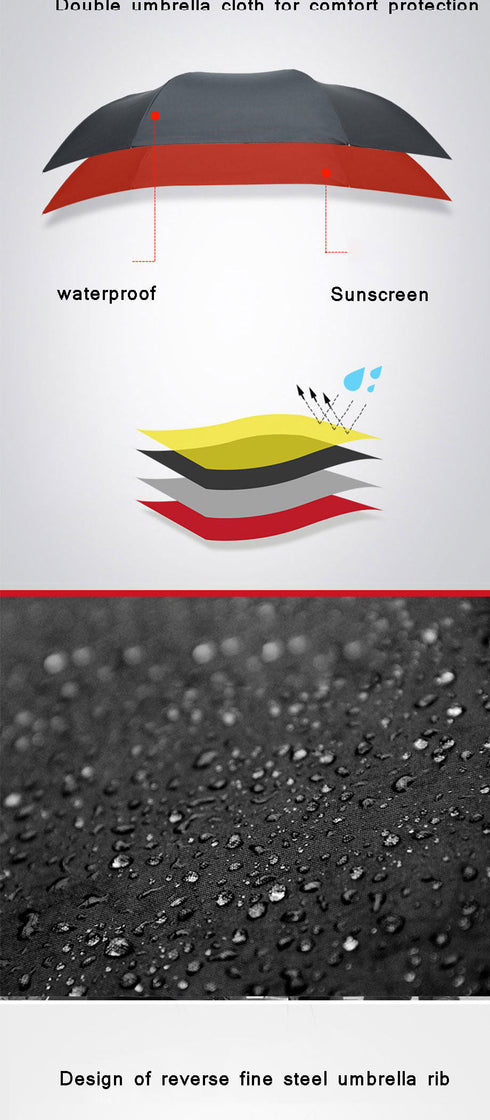 - This exclusive Inverted umbrella is designed with durability, versatility, and comfort in mind. We constructed this umbrella with premium carbon fiber material which is sturdy, corrosion resistant and features double-layer canopy design to protect against UV rays and other harmful sun lights.
